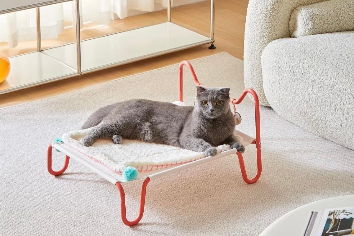 In a warm and minimalist living room, time seems to slow down. A gray cat lies quietly on a small bed with a red metal frame. The white cushion on the bed is soft and comfortable, and the colorful pom-pom decorations on the edges add a touch of playfulness to this little world.
